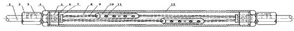 1.礦物絕緣電纜 2.封套螺母 3.壓縮環(huán) 4.封套本體 5.密封罐 6.密封料 7.罐蓋 8.磁套管 9.電纜芯線 10.螺絲壓緊式中間連接管 11.螺絲 12.直通式連接黃銅管
