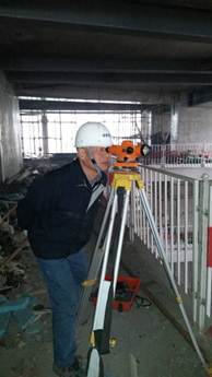 圖14;監(jiān)理人員對安裝的鋼桁架經(jīng)施工單位自檢合格后,進行桁架中柱部位垂直度檢查工作。